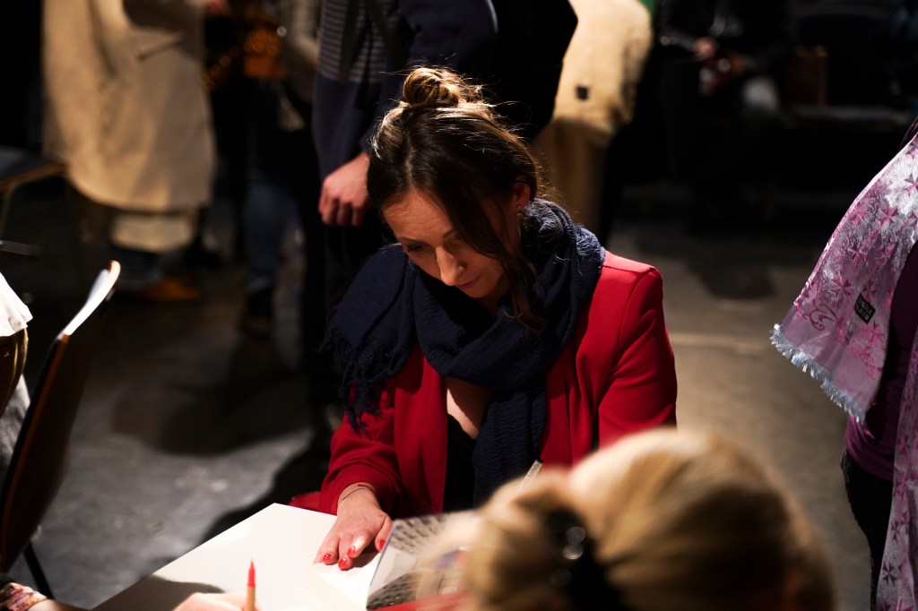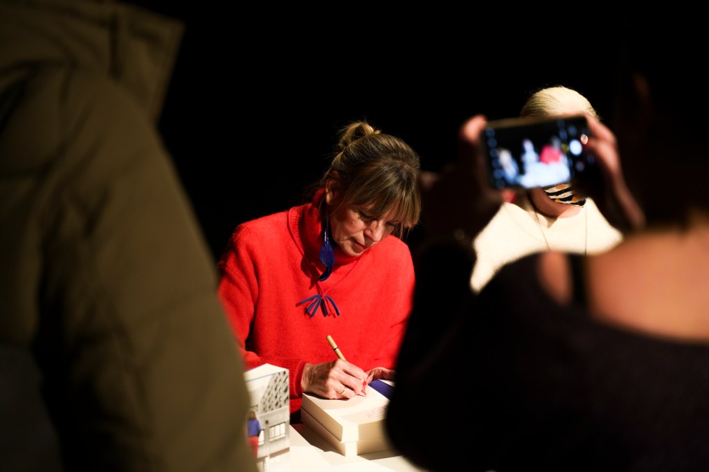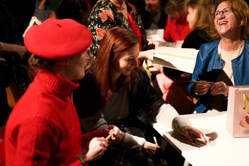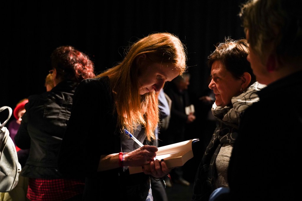 Jönnek és megölelnek és csak habogok. Vagy dadogok. Zavartan teszek egy kört, elkapnak, aláírok. Kint megállok a hideg utcán, hátha felébredek. Visszamegyek, ugyanott vagyok. Jönnek, ölelnek, írok, habogok. Piros a tollam, piros és kék.