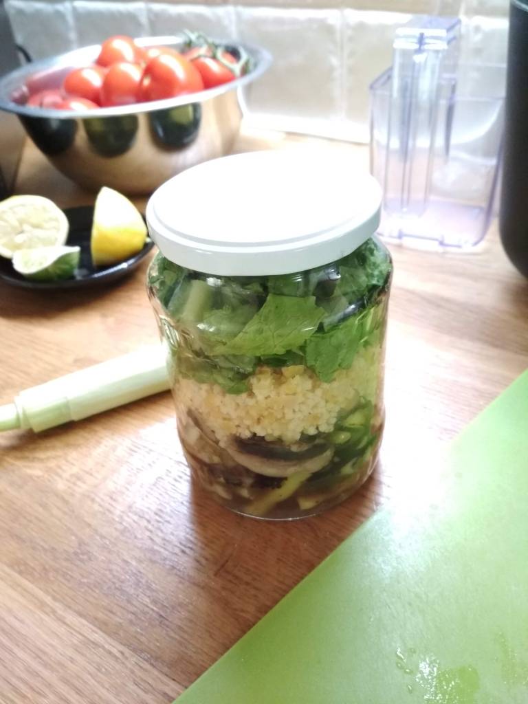 Ebben alul van a hétvégi grillezésből maradt cukkini és padlizsán, csepegtettem rá egy kis citromot, arra tettem a kuszkuszt, a tetején pedig friss salátalevél van, és ami nem látszik a tető miatt, az a pici paradicsom és sajt. Mi úgy esszük ezt, hogy beteszem hűtőtáskába, viszek hozzá villát, és ahol kedvünk van piknikezni, ott leülünk és kicsit összekeverjük, aztán kész.